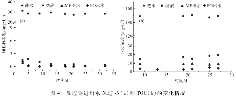 為了考察MFO-MBR去除氨氮和有機物的性能,分別測定進水、污泥濾液、FO膜和MF膜出水的NH4+ -N和TOC濃度,結果如圖4所示。從圖4(a)可以發現,活性污泥濾液中的NH4+ -N濃度初始階段略高,隨后呈下降趨勢,比較終穩定在0. 5 mg / L 左右,而MF出水和FO出水NH4+ -N去除率始終高達98%。從圖4(b)還可以發現,污泥上清液TOC濃度維持在18 mg / L左右,生物作用去除了88%的有機物,而FO的截留作用較MF截留效果更突出,比較終FO出水TOC的去除率可達到96%以上,但是MF膜的出水TOC也始終小于10 mg / L 。綜合NH4+ -N和TOC的去除情況,MF膜的加入有效緩解了鹽度積累的問題,使反應器維持在低鹽度的環境下運行,有效提高了NH4+ -N的生物去除效果,而由于FO膜的高截留性能,TOC的濃度大幅下降,保證了出水水質的穩定。從出水水質來看,MFO-MBR中的MF的出水可以滿足城市雜用水的水質要求,而FO的出水在經過RO的處理后完全可以達到飲用水的標準。