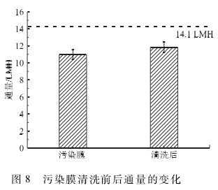 實驗結束后,以去離子水為原料液,測定污染膜的水通量。測試結束后,立即將膜面的污染物采用自來水沖洗的方式進行清洗,然后以去離子水為原料液,測定簡單物理清洗后膜的水通量。污染FO膜以及物理清洗后的膜通量如圖8所示。采用膜評價裝置在同等測試條件下獲得新TFC膜初始通量為14. 1LM H。從圖8可以看出,污染膜通量僅為新膜通量的72.8 %,下降了27.2%。然而,經過簡單的物理清洗后,FO膜的通量恢復為新膜通量的84.0%,提升了11.2%,但與新膜仍有一定的差距。這說明加入MF膜后,在鹽度得到控制的前提下,膜污染成為通量衰減的主要原因,且主要為不可逆污染。與同等運行條件下的CTA膜相比,TFC膜在經過物理清洗后的通量恢復效果較差。在今后的研究中需要繼續開展TFC膜的化學清洗研究,進一步提升通量的恢復效果。