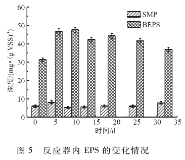 從圖5可以看出,活性污泥的SMP和BEPS含量在初始階段都有上升的趨勢,然后趨于穩定。結合圖3中反應器內電導率的變化情況,初始階段鹽度的突然上升導致污泥產生大量的EPS,而隨著時間的推移,反應器內鹽度穩定,EPS的含量亦沒有較大的變化。在已有的OMBR研究中,由于鹽度沒有控制,會出現EPS含量持續上升的情況。然而,雖然本研究的EPS含量比較穩定,但是其含量較高。考慮到EPS對膜污染的重要貢獻,穩定的高EPS濃度可能會加重MFO-MBR運行過程中FO膜的生物污染。