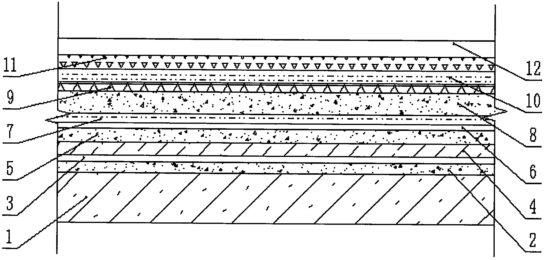 1.一種衛生間防水處理結構,包括鋼筋混凝土基層(1)、水泥砂漿找平層I(2)、基層處理劑膠粘層(3)、隔離層(4)、水泥砂漿找平層II(5)、涂布底膠層(6)、涂膜防水層I(7)、防潮層(8)、耐堿玻纖網格布(9)、涂膜防水層II(10)、水泥砂漿結合層(11)和裝飾面層(12),其特征在于:鋼筋混凝土基層(1)設置在水泥砂漿找平層I(2)的下方,基層處理劑膠粘層(3)設置在水泥砂漿找平層I(2)的上方,隔離層(4)粘貼在基層處理劑膠粘層(3)的上方;水泥砂漿找平層II(5)設置在隔離層(4)的上方,涂膜防水層I(7)設置在涂布底膠層(6)的上方,防潮層(8)設置在涂膜防水層I(7)的上方,耐堿玻纖網格布(9)設置在防潮層(8)的上方,涂膜防水層II(10)設置在耐堿玻纖網格布(9)的上方;水泥砂漿結合層(11)設置在涂膜防水層II(10)的上方,裝飾面層(12)設置在水泥砂漿結合層(11)的上方。