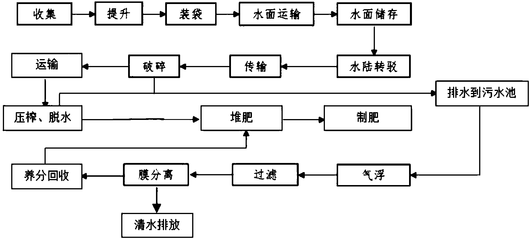 作為對技術方案的改進,所述水葫蘆打撈及處理工藝還包括污水處理工藝,所述污水處理工藝用于處理所述污水池中收集的步驟S5和步驟S6所產生的污水。