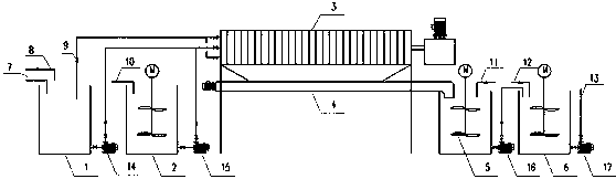 1.一種水處理吸附劑再生系統(tǒng),包括板框壓濾機(jī)(3),其特征在于所述的板框壓濾機(jī)(3)的進(jìn)料端管路連接濃縮池(2)和液堿罐(1),所述的板框壓濾機(jī)(3)的出料端管路連接液堿罐(1),所述的板框壓濾機(jī)(3)的卸料端下方配合設(shè)置螺旋輸送機(jī)(4),所述的螺旋輸送機(jī)(4)的出料端連接粉碎攪拌機(jī)(5),所述的粉碎攪拌機(jī)(5)管路連接加藥池(6),所述的加藥池(6)出料端連接吸附劑加藥管(13)。