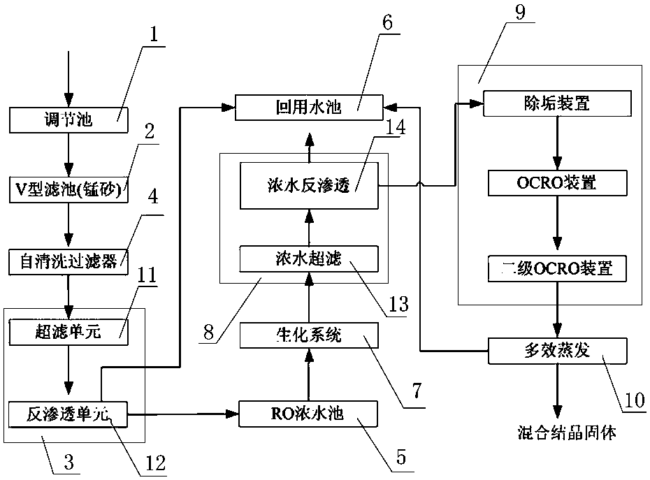 技術人員介紹,該系統包括一匯集污水的調節池,其后相接著主要由V型濾池構成的預處理系統,該預處理系統之后相接著一級“超濾+反滲透”系統,其特征在于所述一級“超濾+反滲透”系統中的反滲透單元之后,一路反滲透濃水進入與之相連的至少一級頻繁倒極電滲析系統并進行濃縮,另一路淡水連接回用水池或與回用水池的回用淡水出口管相通;所述頻繁倒極電滲析系統之后的濃水出口接于一可對一價和二價鹽進行分離的一二價分離電滲析系統,該一二價分離電滲析系統后面相連有一對一價鹽進行濃縮回收并得到結晶氯化鈉的MVR蒸發裝置,而所述一二價分離電滲析系統后面的淡水出口連接有至少另一級頻繁倒極電滲析系統,經過該頻繁倒極電滲析系統之后的淡水出口連接回用水池,濃水出口相接有另一能夠得到硫酸鈉結晶鹽的MVR蒸發裝置。