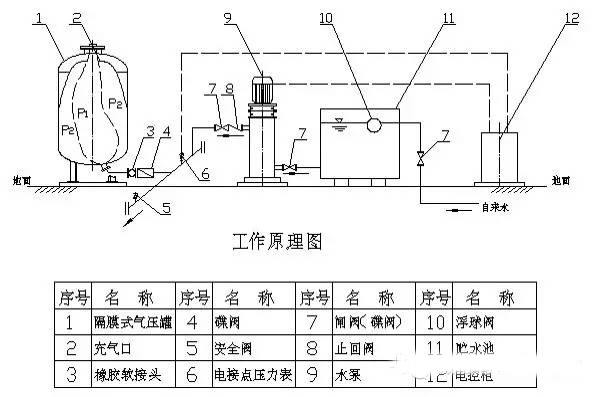 系統中定壓點壓力確定:定壓點壓力的高低要考慮兩個因素,一個是系統運行時任一點都不超壓,二是系統停運時系統不倒空。如果定壓點的壓力過高,系統中的每一點的壓力也就相應的增高,導致管道、閥門或設備等在高壓下運行,出現強度破壞或疲勞損壞。壓力設置太低,系統就會倒空出現氣堵,而導致介質循環不暢。氣壓罐工作壓力值按以下方法確定(推薦) (1)補水泵啟動壓力P1: P1=Po+0.005;“Po”系統最高點壓力 (2)補水泵停泵壓力P2:
